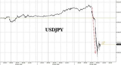 And while the market had grown used to constant jawboning by Japanese officials, this time Japan finally put its money where its mouth was, and with the USDJPY extending gains after all this verbal diarrhea, at precisely 4am ET, or just as Japan was closing (as we head into a long weekend, with most of Asia off tomorrow and Japan kicking off with golden week starting Monday to Wednesday 6th May), the USDJPY tumbled sharply, and then continued to slide for the next 4 hours, plunging as much as 500 pips to a session low of 155.57.